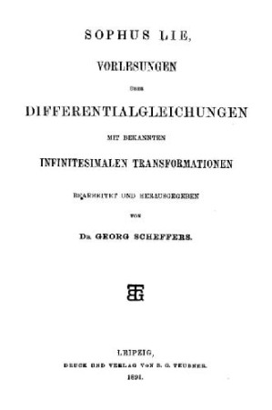 Vorlesungen über differentialgleichungen, mit bekannten infinitesimalen transformationen. Bearb. und hrsg. von dr. Georg Scheffers.